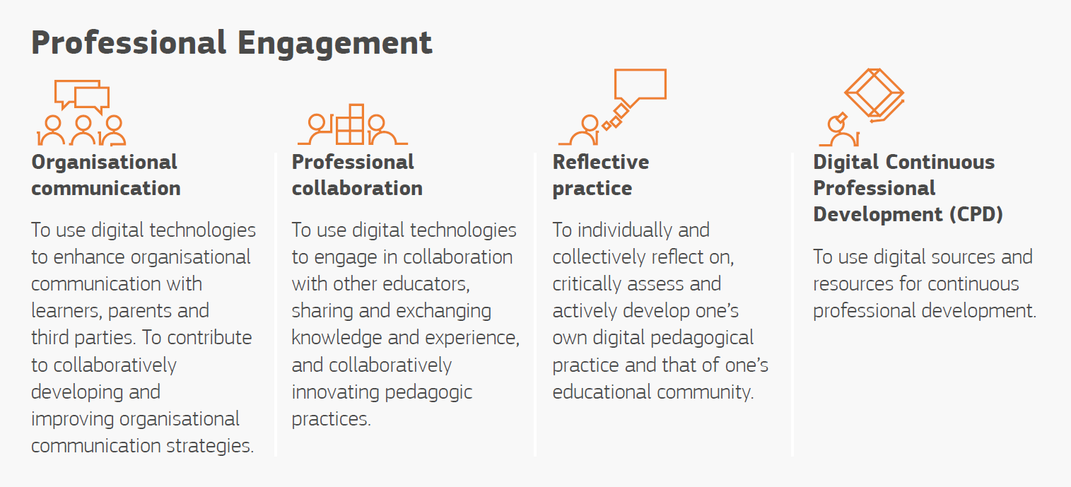 An educator should not only be able to use digital technologies for teaching, but also for their professional engagement, such interactions with colleagues and continuous professional development.
