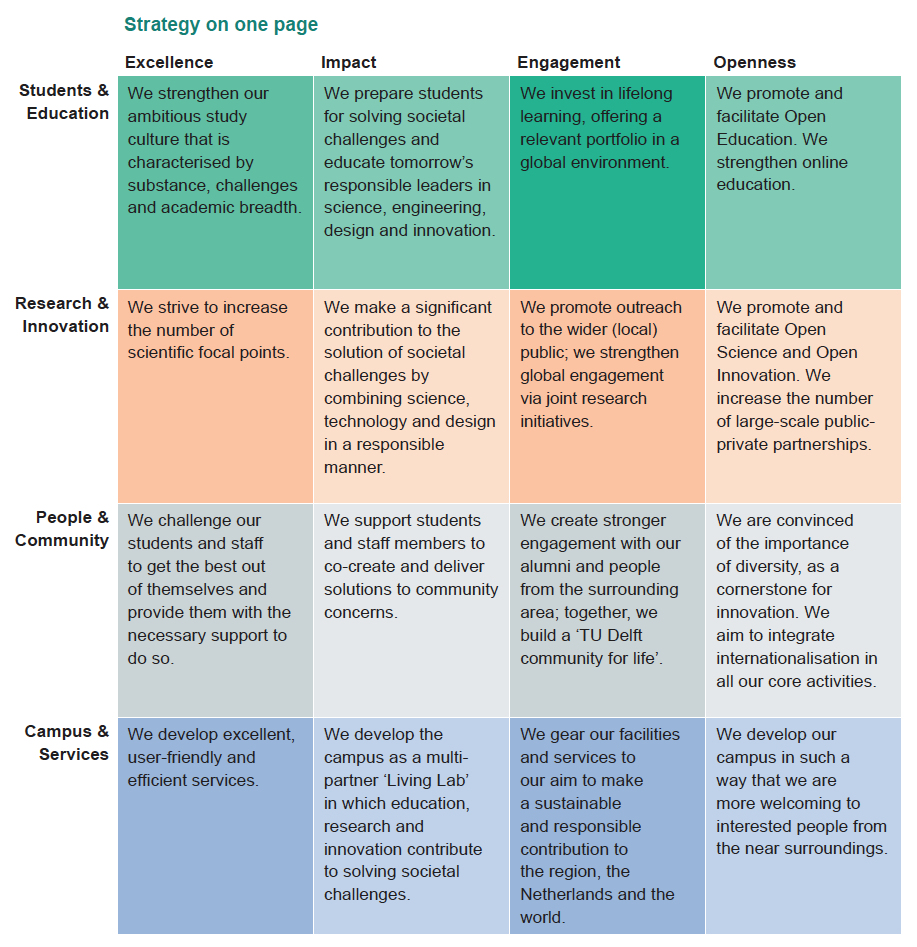 Last Friday at the 176th Dies Natalis (foundation day) of the TU Delft the new strategic framework 2018-2024 was presented. The structure of the framework is based on two dimensions. First, the breakdown of the university’s core operations into four operational areas: Students & Education, Research & Innovation, People & Community, and Campus & Services. The second dimension is based on four major principles: Excellence, Impact, Engagement and Openness. In the matrix below these two dimensions are linked.